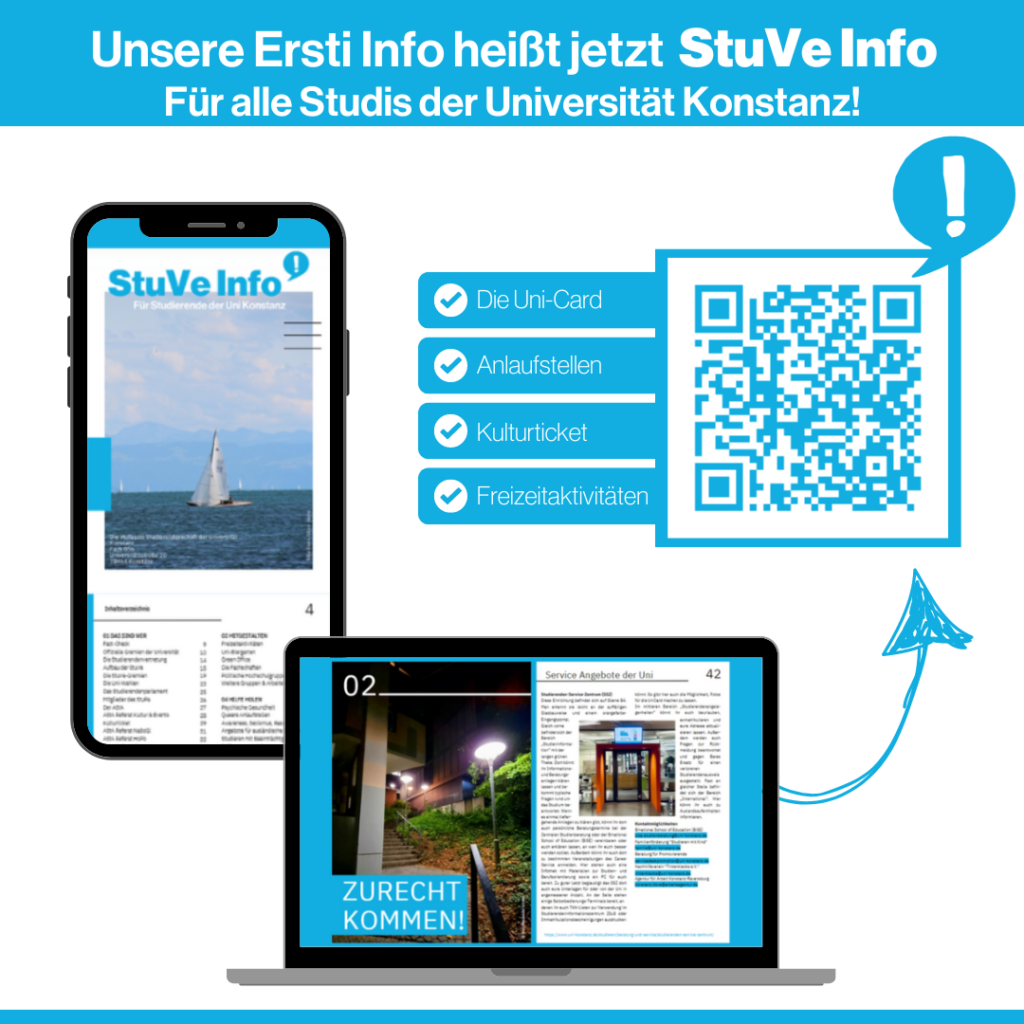 Hier findet ihr Informationen und Hilfreiches rund um das Thema Studium, Wohnen oder Geld. Falls Ihr Fragen habt, die hier nicht beantwortet werden konnten, dann schreibt uns eine Mail an stuve@uni-konstanz.de. Wir versuchen all Eure Fragen zu beantworten.