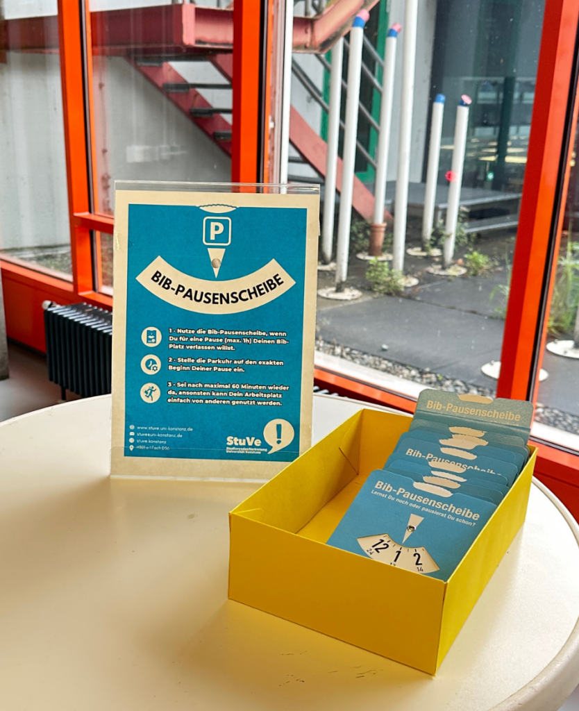 Das Reservieren von Plätzen ist in der Uni-Bibliothek nicht erlaubt. Mit unseren Bib-Pausenscheiben kennzeichnest Du aber, dass Du „Deinen“ Bib-Platz nur für eine kurze Pause (maximal 1 h) verlassen willst. Du findest sie vor den Eingängen zum Buchbereich BS. Die Bib-Pausenscheibe ist Eigentum der StuVe und nur in den Räumen der Uni-Bibliothek zu nutzen. Sie ist nach § 13 StVO nicht für den Straßenverkehr zugelassen!